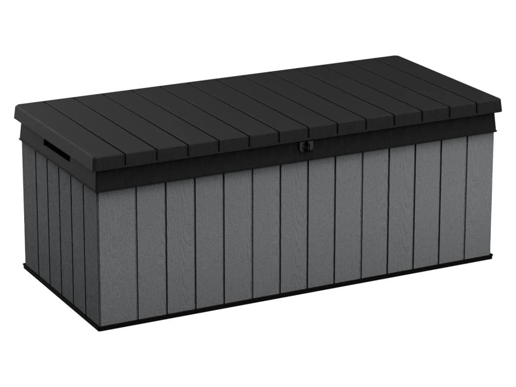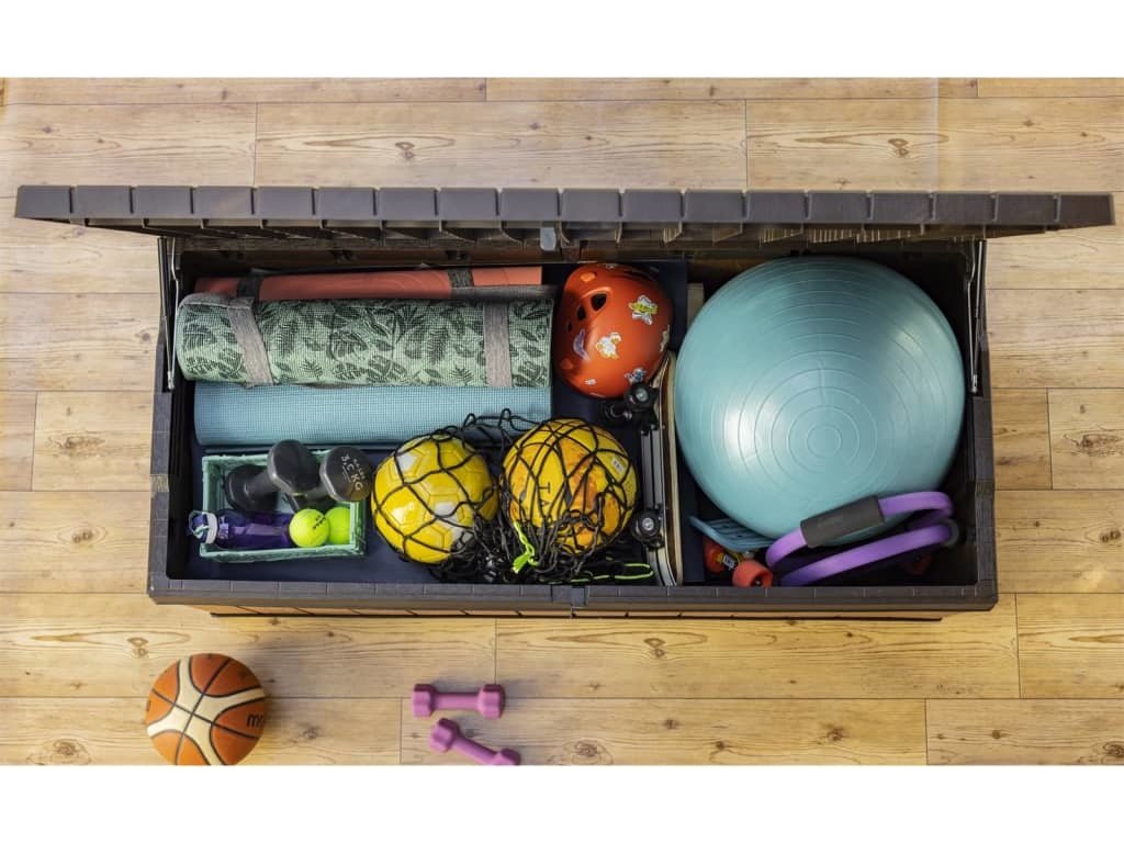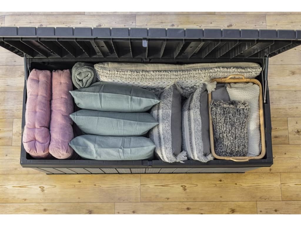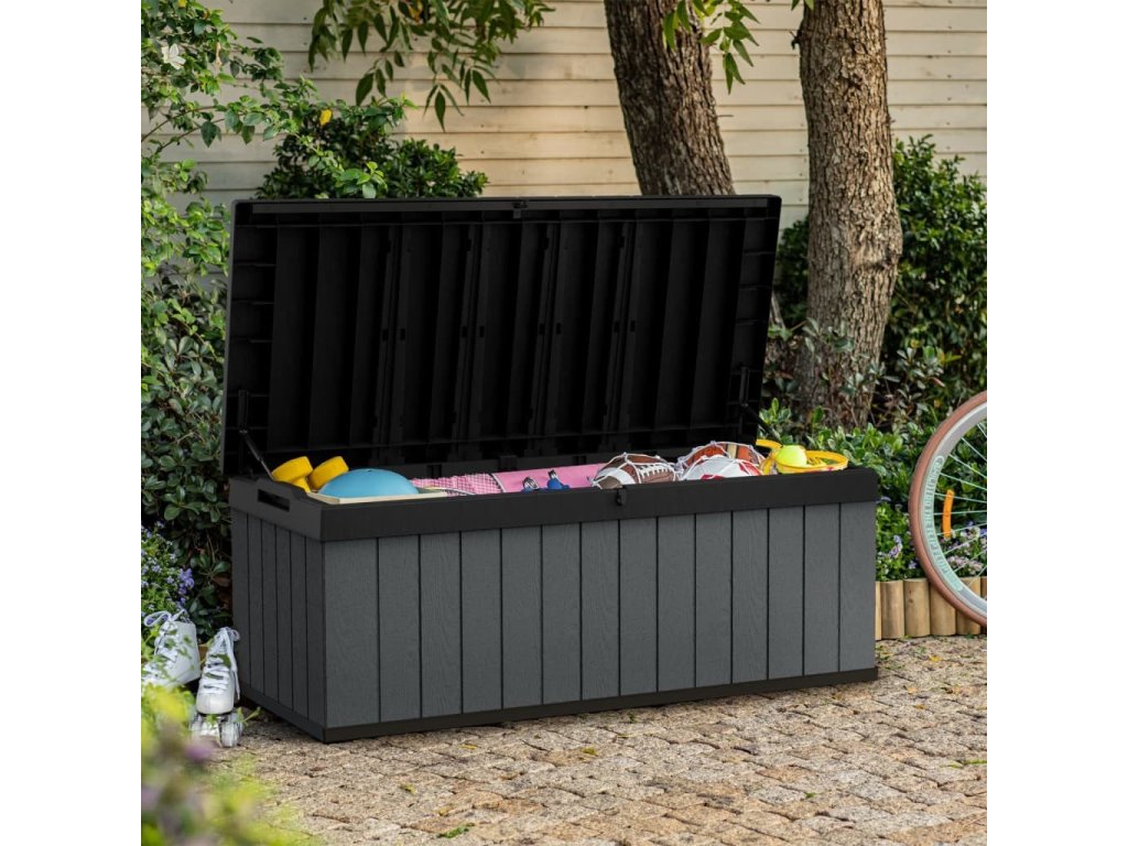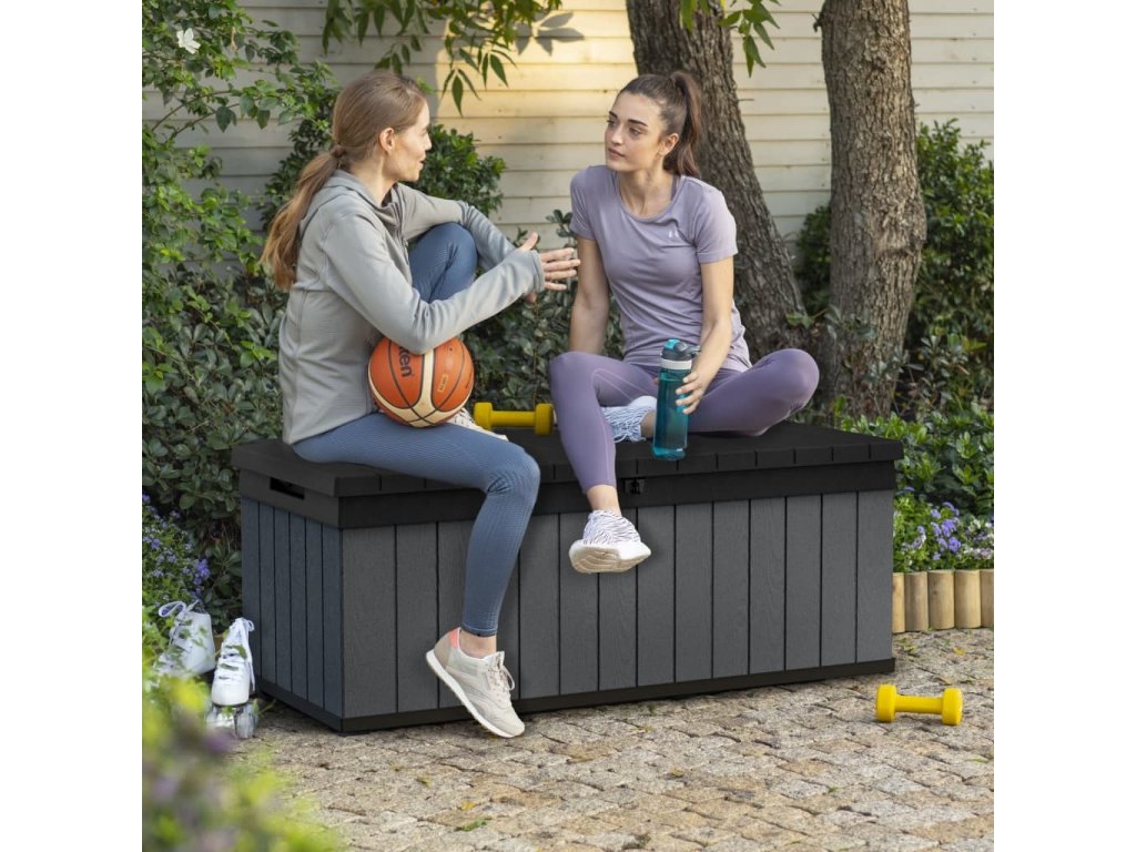 Najděte pro box ideální místo na zahradě. Díky struktuře, která připomíná dřevo, zapadne do každého prostředí. Uložené věci navíc můžete uzamknout uvnitř boxu. Hydraulický pístový systém zajistí plynulé a bezpečné zavírání a otevírání víka. Po zavření se na něj navíc usadí až 2 lidi.