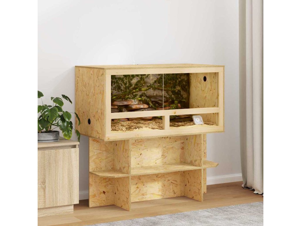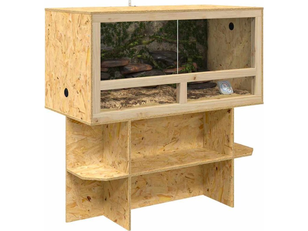 - Prostorný úložný prostor: Obsahuje police z OSB materiálu, které poskytují skvělou možnost pro uložení věcí potřebných pro péči o plazy nebo dekorativní doplňky. Tyto police zaručují, že mazlíčci mají vše potřebné pro pohodlný a stimulující habitat, díky čemuž se domovy transformují na úchvatné výstavní plochy přírodní krásy.