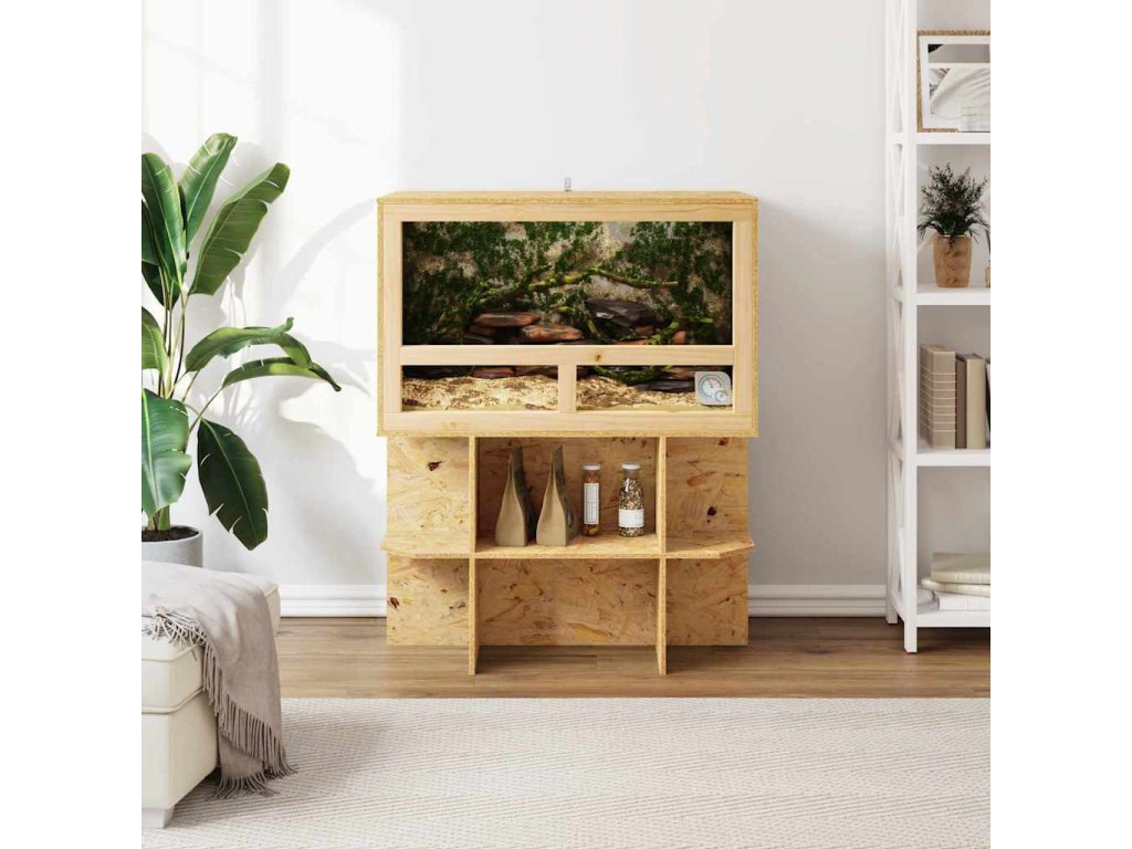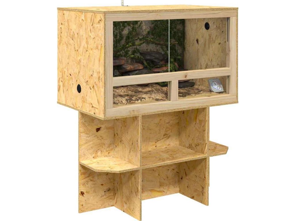 - Prostorný úložný prostor: Obsahuje police z OSB materiálu, které poskytují skvělou možnost pro uložení věcí potřebných pro péči o plazy nebo dekorativní doplňky. Tyto police zaručují, že mazlíčci mají vše potřebné pro pohodlný a stimulující habitat, díky čemuž se domovy transformují na úchvatné výstavní plochy přírodní krásy.