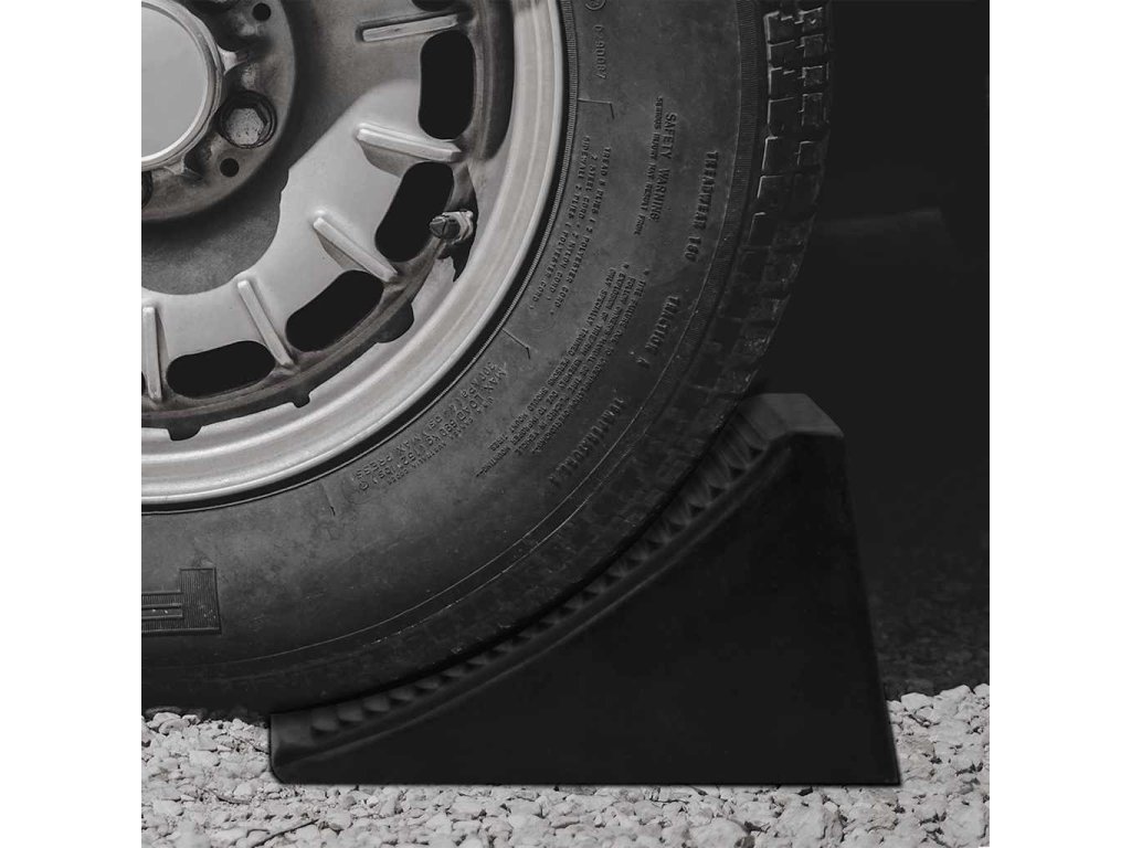 Zarážka pod kola je vyrobená z pryže a má pevnou konstrukci. Chytrý design umožňuje snadné zasunutí klínů v požadovaném úhlu, zatímco protiskluzový povrch horní strany zase zajišťuje delší přilnavost kol. To přispívá k udržení stability vozu a maximální bezpečnosti.