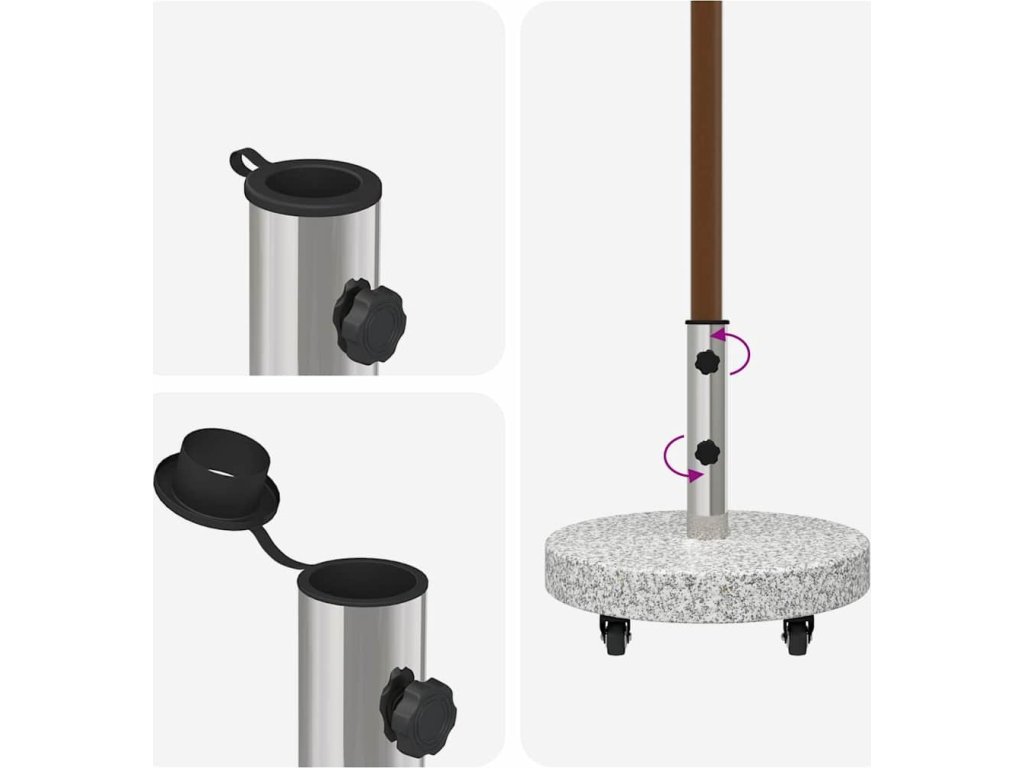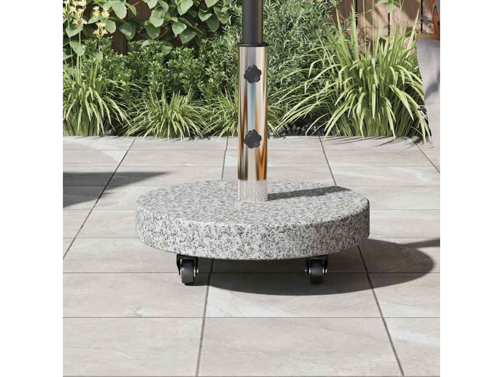 - Žula a nerezová ocel: Tento podstavec pro slunečník má pevný žulový základ, který zaručuje stabilitu, i když nefouká vítr. Nerezová ocel slibuje dlouhou životnost a elegantní vzhled, takže podstavec vypadá skvěle, i když je vystaven slunci a povětrnostním podmínkám.
