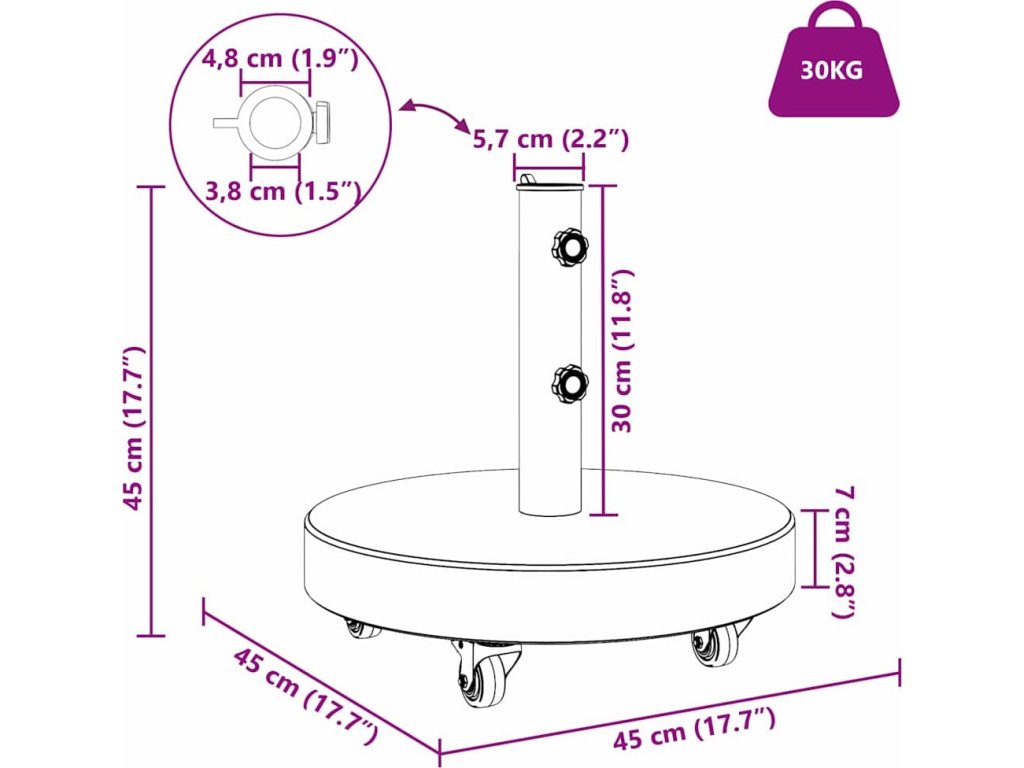 Tento kulatý podstavec pro slunečník vypadá skvěle a je praktický, takže je ideální do zahrad a na terasy. Je navržen tak, aby byl moderní, jednoduchý a funkční, což z něj dělá ideální volbu pro letní uspořádání. Žulový základ zajišťuje stabilitu a nerezová ocel zvyšuje jeho odolnost, takže se nemusíte bát, že by se slunečník při špatném počasí převrátil. A díky rolovacímu mechanismu ho lehce přemístíte, takže si můžete užít sluníčko kdykoli chcete.