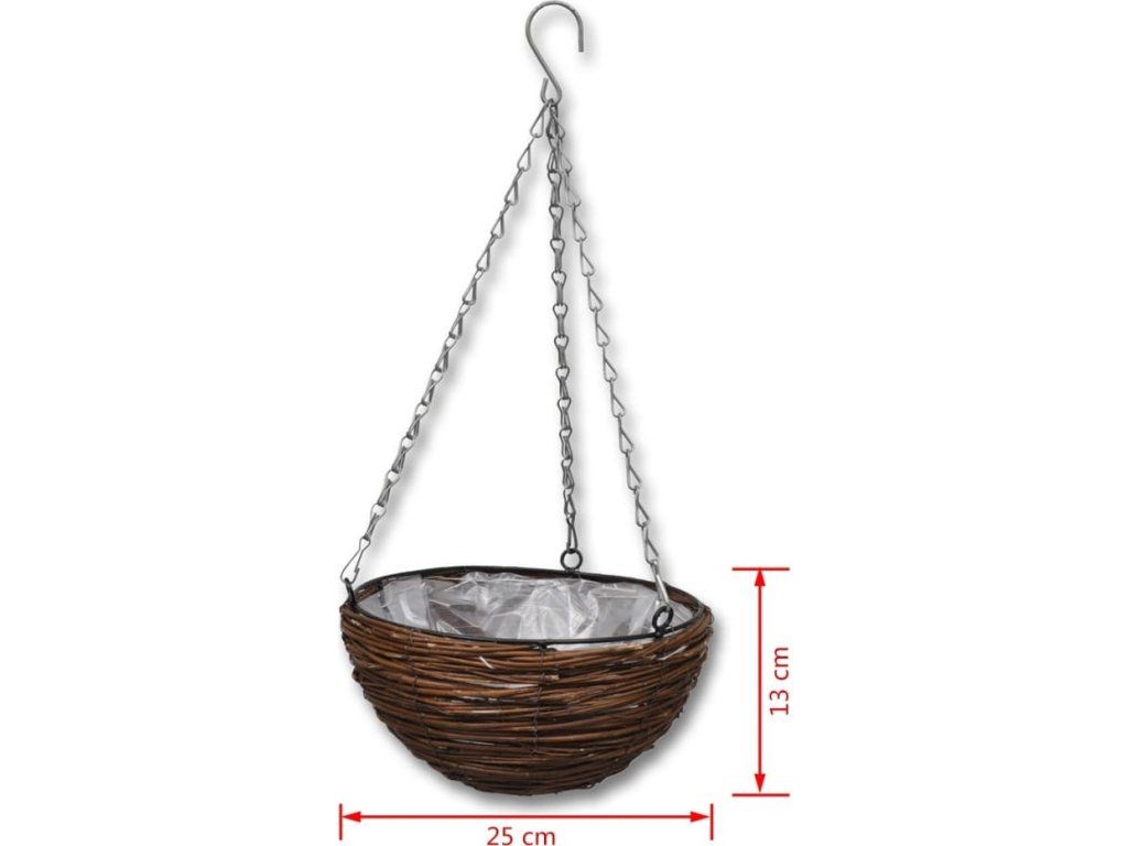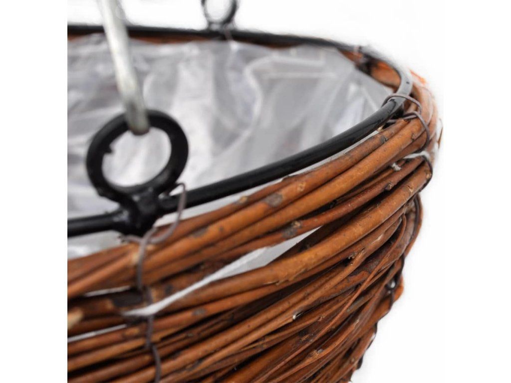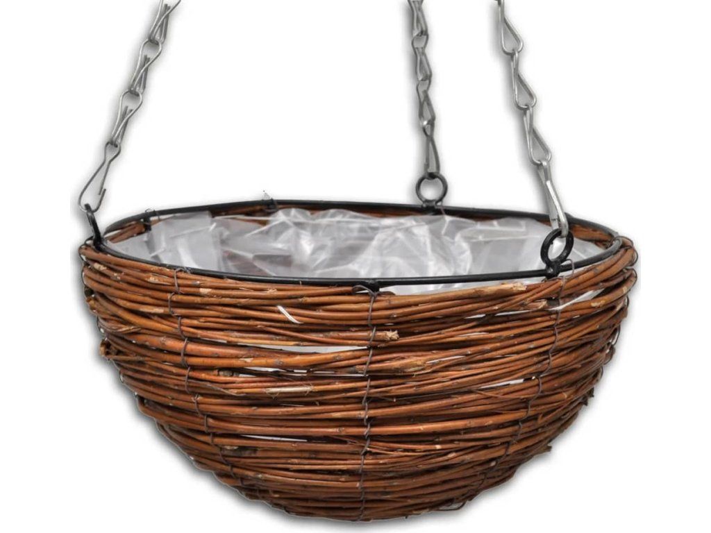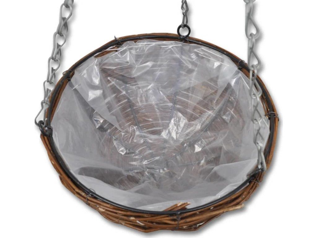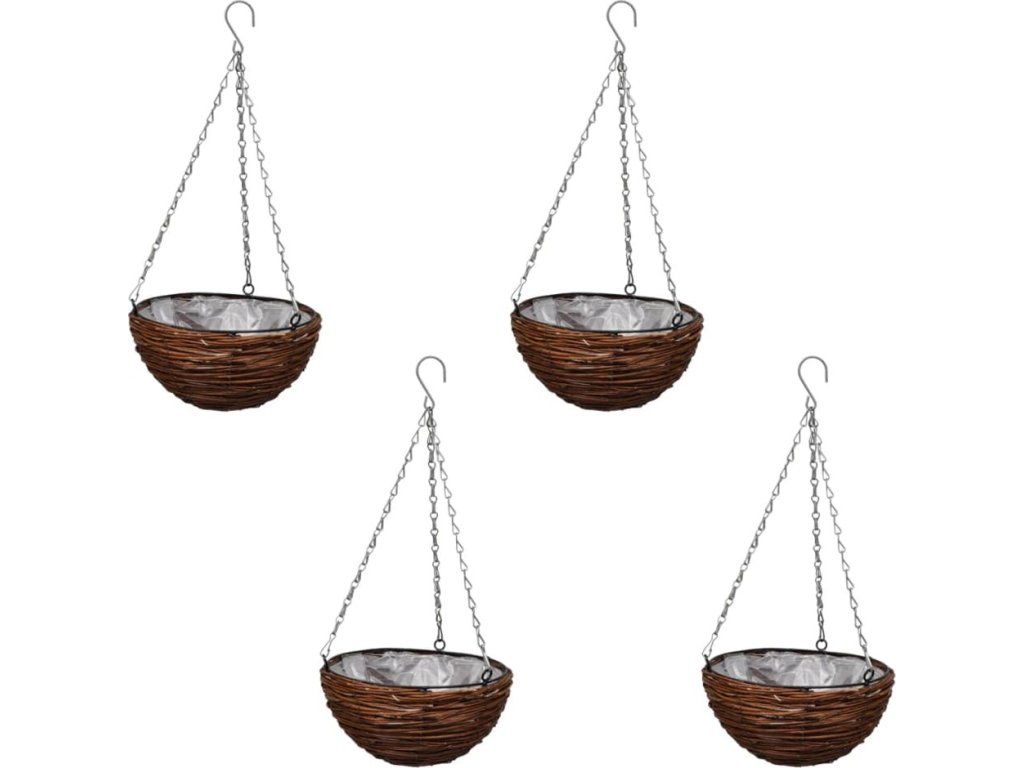 Tento set 4 ks závěsných proutěných košíků na květiny s přírodním rustikálním vzhledem z vrbového proutí je stylový a praktický. Je ideální pro zahrady, terasy a balkony, ale také mohou být snadno a rychle zavěšeny v interiéru.Košíky jsou vyrobeny z vrbového proutí odolného proti povětrnostním vlivům a jsou vyztuženy kovovým rámem, což zajistí dlouhou životnost a odolnou konstrukci. Vysoce kvalitní květináče mají uvnitř plastovou vložku, aby se zabránilo úniku vody a půdy. Košíky se zavěšují pomocí 3 pevných řetězů. Mohou být zavěšeny ze stropů, vedle oken nebo na zábradlí.