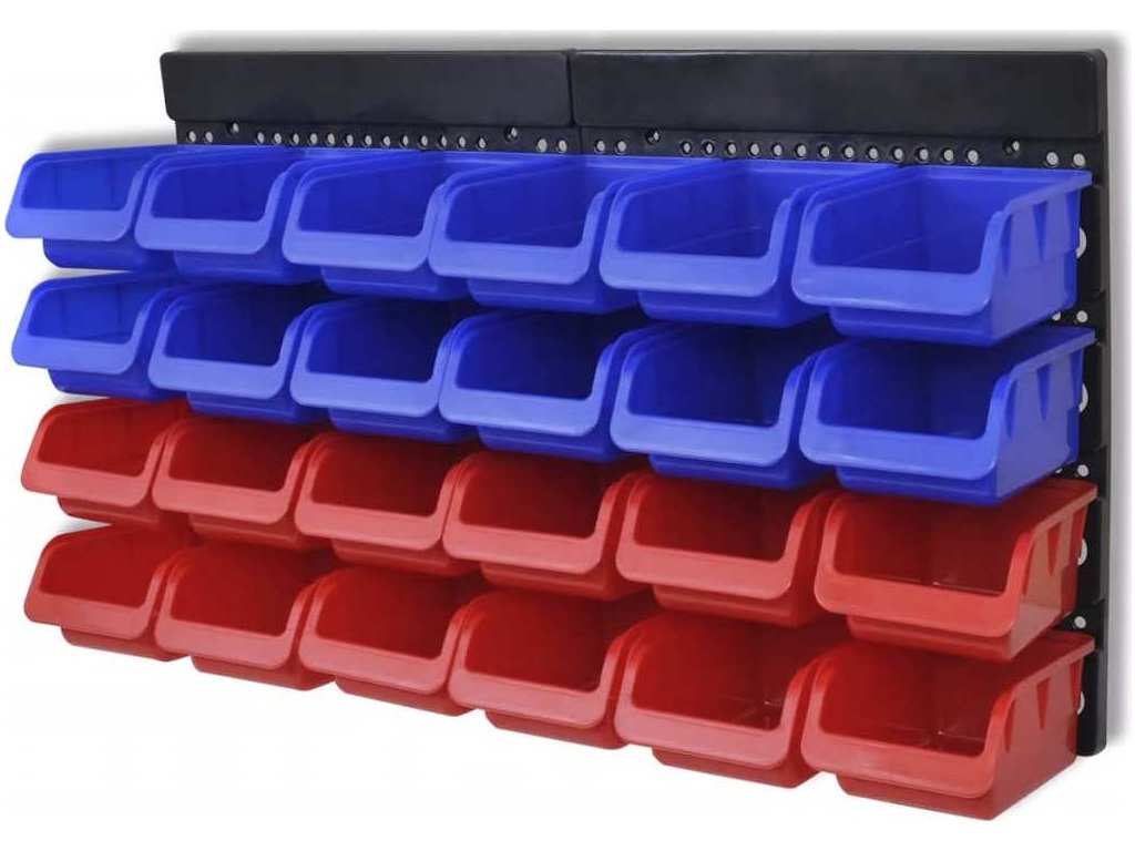 Odnímatelné a stohovatelné zásobníky/přihrádky jsou vyrobeny z polypropylenu s vysokou hustotou, který odolává vysokým teplotám a je také odolný vůči většině průmyslových rozpouštědel. Pevné děrované desky lze snadno namontovat na stěnu.