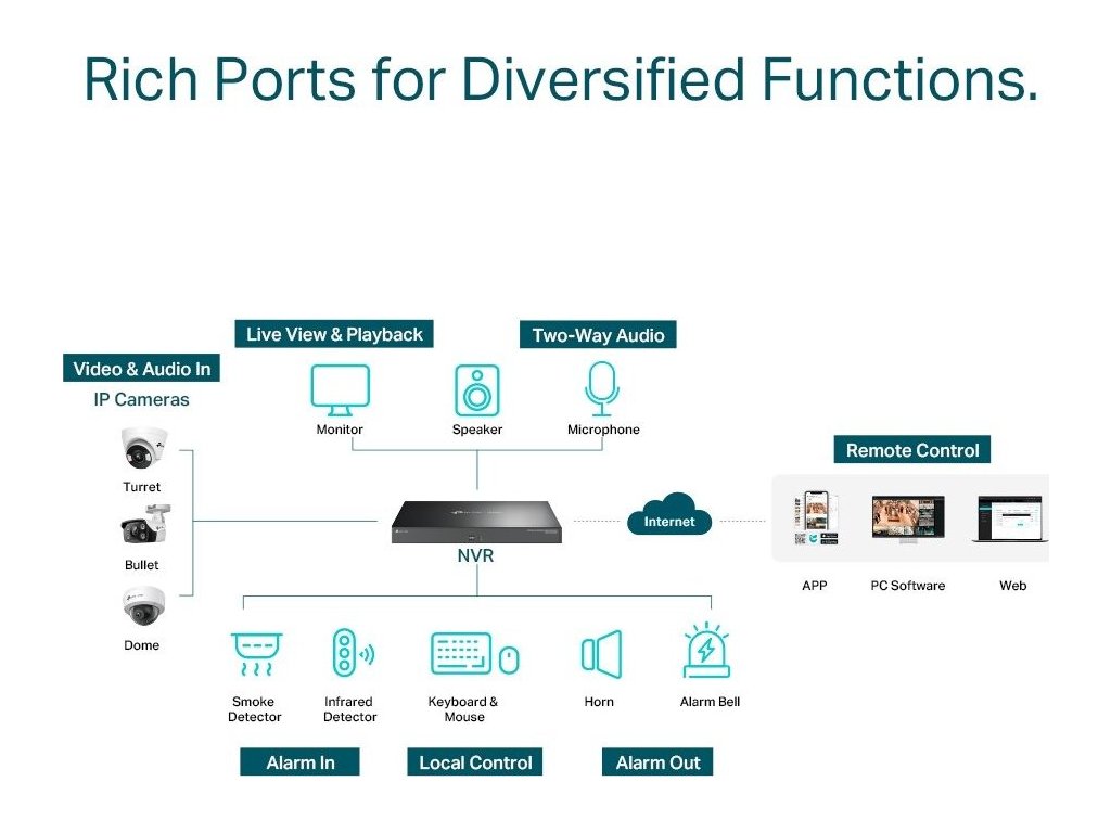 Na rekordéru najdete porty HDMI a VGA pro připojení monitoru či jiného zobrazovacího zařízení a také audio vstup i výstup pro obousměrnou konverzaci. Tato funkce se hodí například při nečekaných návštěvách či při vyzvedávání zásilek z rukou kurýra. Nechybí ani konektory pro připojení k síti Ethernet, který zajistí spolehlivé kabelové připojení pro nonstop nahrávání a monitoring záznamů.