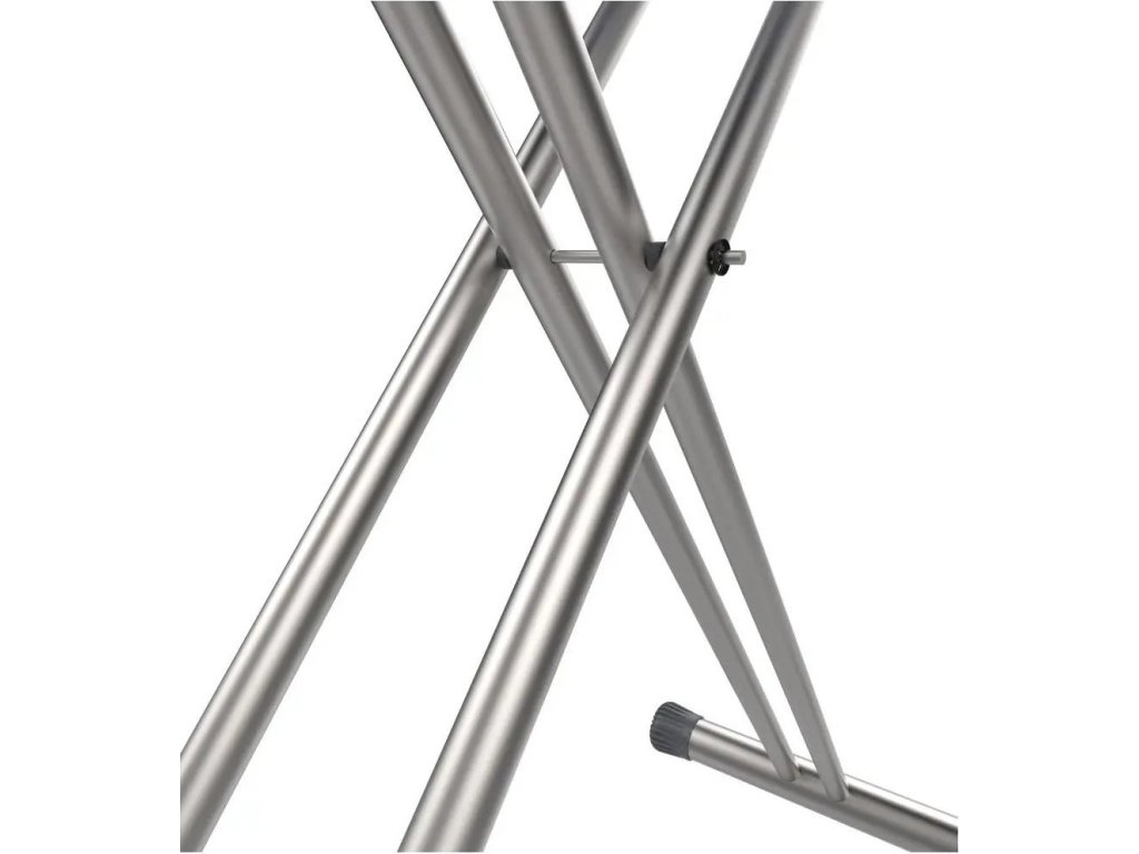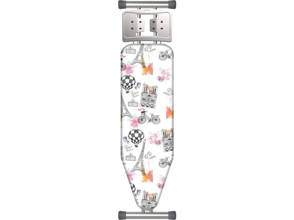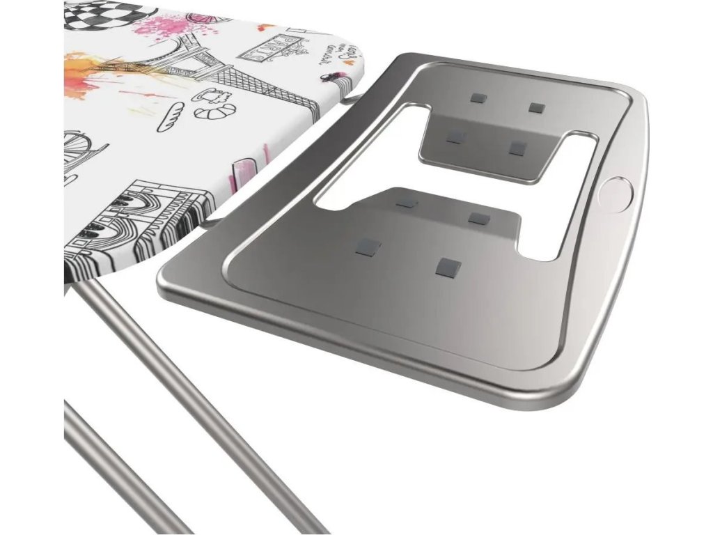 Kovová konstrukce má stříbrnou elektrostatickou práškovou barvu. Speciální nástřik ji chrání proti korozi. Nohy konstrukce jsou vybavené plastovými protiskluzovými koncovkami, které zajišťují její stabilitu. Na jednom konci prkna se nachází praktická odkládací plocha na žehličku. V případě potřeby ji tam kdykoliv položíte. Silikonové podložky brání ve sklouznutí žehličky.