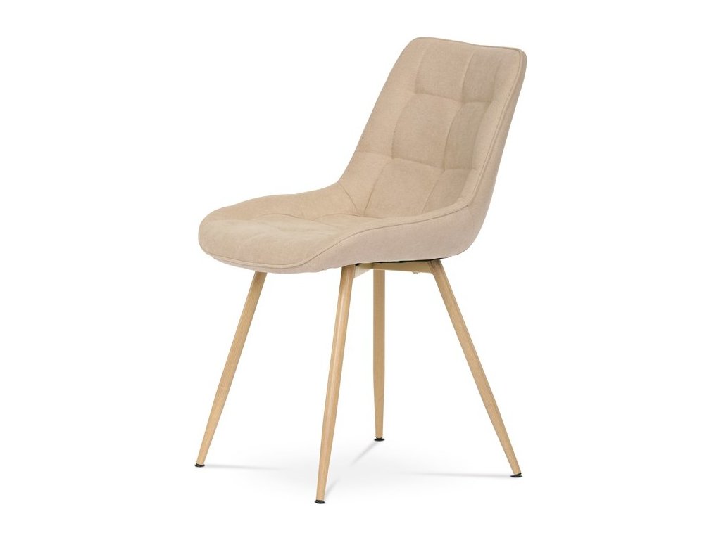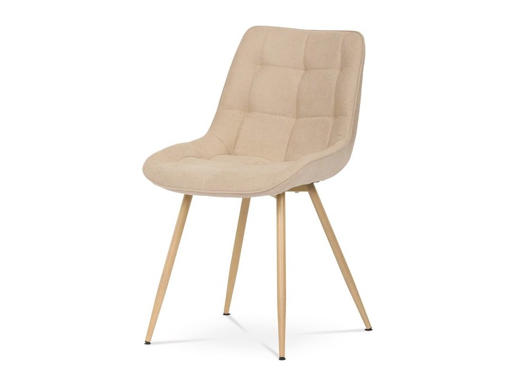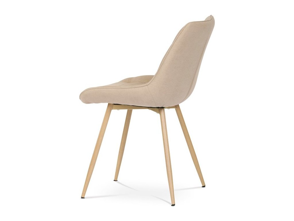 Designová skořepinová jídelní židle je čalouněna krémovou látkou s výrazným prošitím sedací části i části určené k opření. Sedací část je zaoblená a má vyvýšené boky, plynule přecházející do opěráku. Polstrování je z kvalitní PU pěny. Čtyřnohá kovová podnož je v 3D dekoru dub. Nohy jsou kruhového průřezu a kónické, ukončené černými platovými kluzáky. Celá podnož je svařená a dodávána jako celek, nehrozí tedy občasné dotahování šroubů jako u podnože šroubované.Toto vše působí nejen jako stylový designový prvek, ale dělá židli velmi pevnou, pohodlnou a praktickou na kratší i delší posezení. Svým provedením ve Skandinávském stylu a decentní barevností se židle hodí nejen k jídelnímu stolu, ale i jako součást pracoven či konferenčních místností.