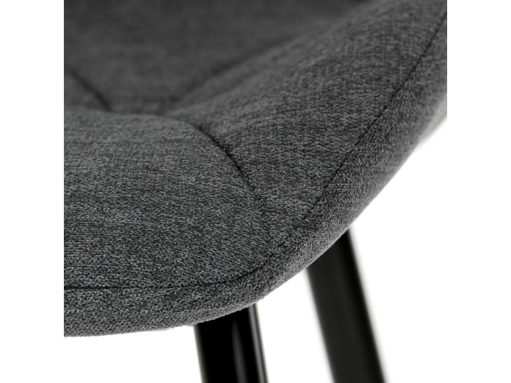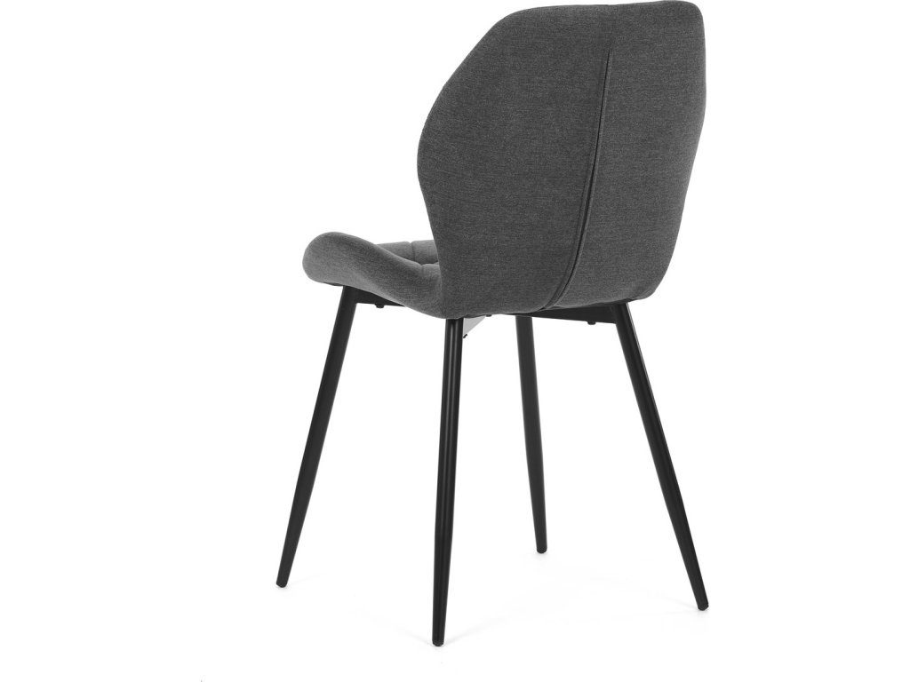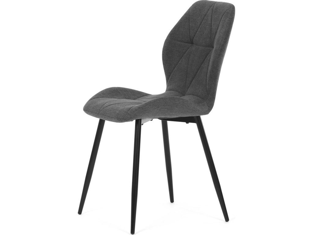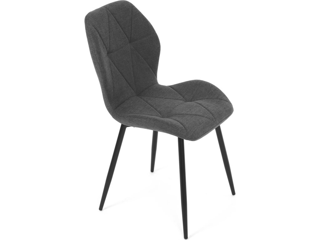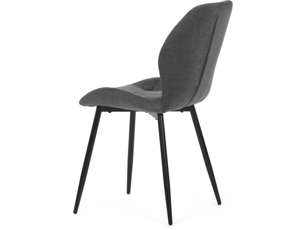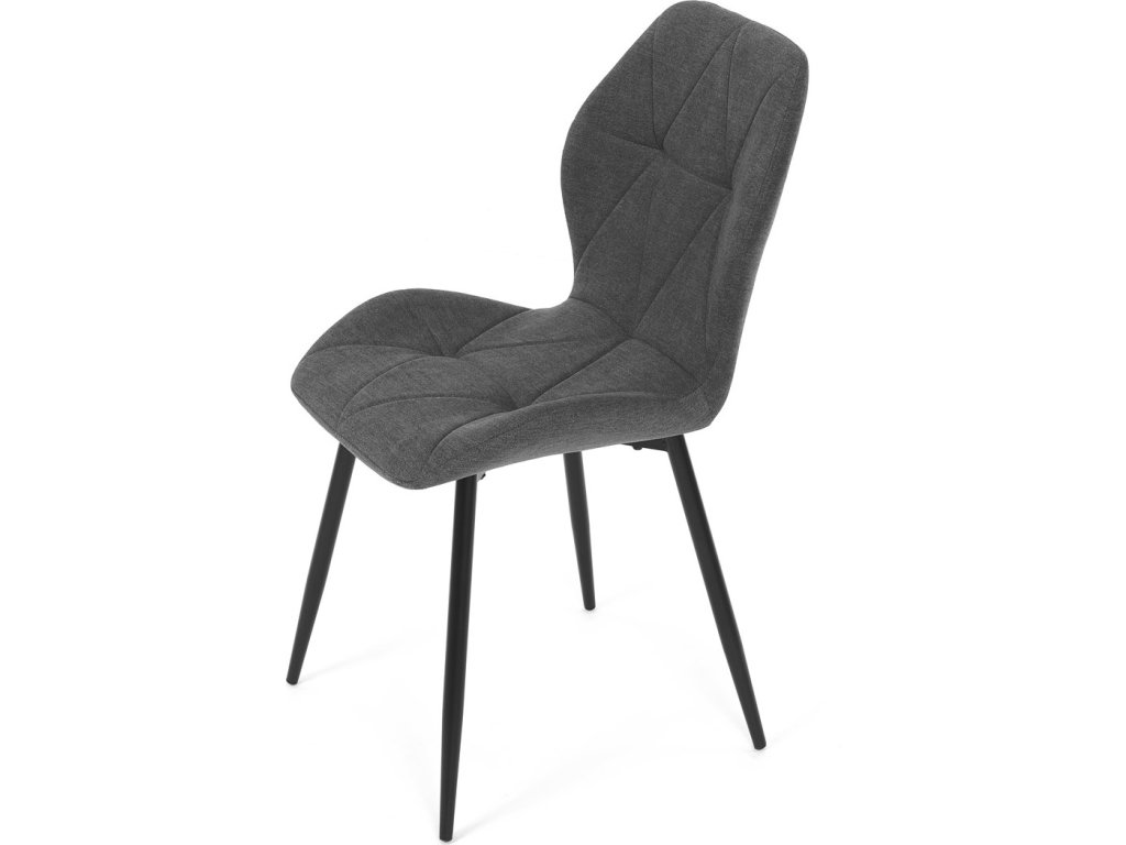 Židle je čalouněná kvalitní tmavě šedou látkou, která je měkká na dotek a zároveň odolná proti opotřebení. Ergonomicky tvarované sedadlo a opěradlo s dekorativním prošíváním poskytují vysoký komfort i při delším sezení. Židle stojí na pevných kovových nohách v černém provedení, které zajišťují stabilitu a dlouhou životnost. Nohy jsou elegantně zkosené, což dodává židli moderní vzhled a zajišťuje pevnou stabilitu.