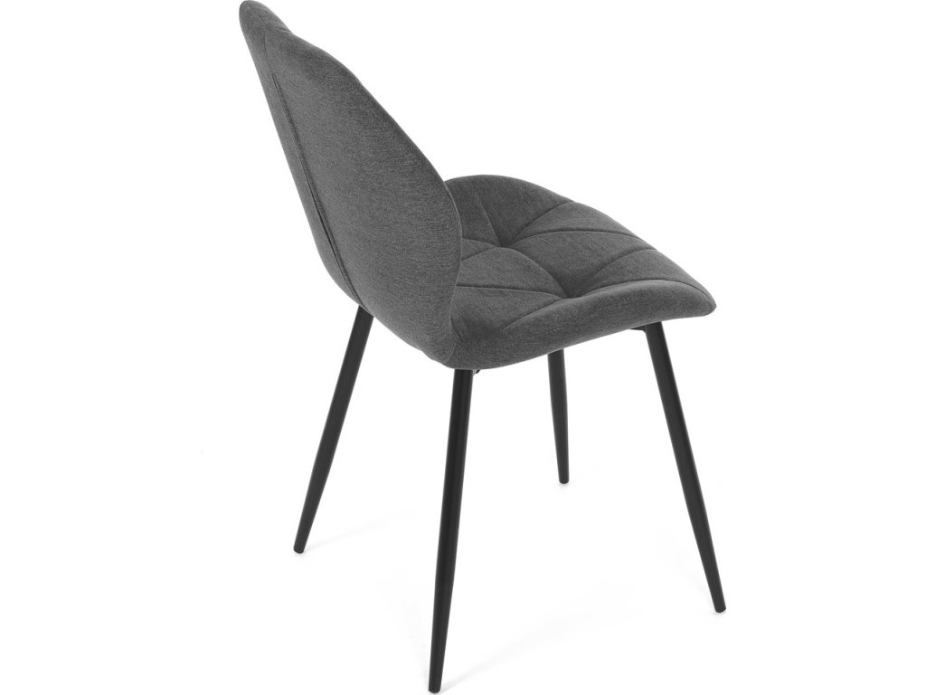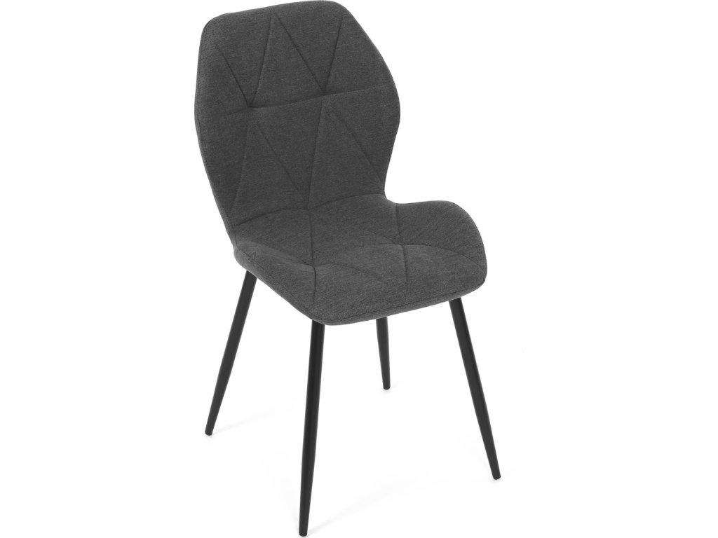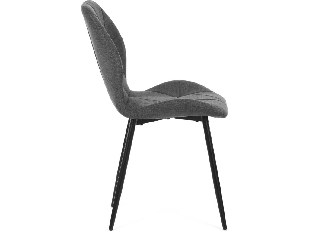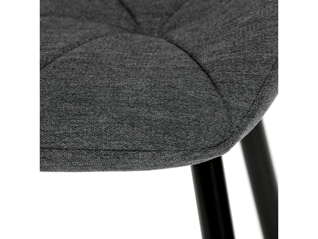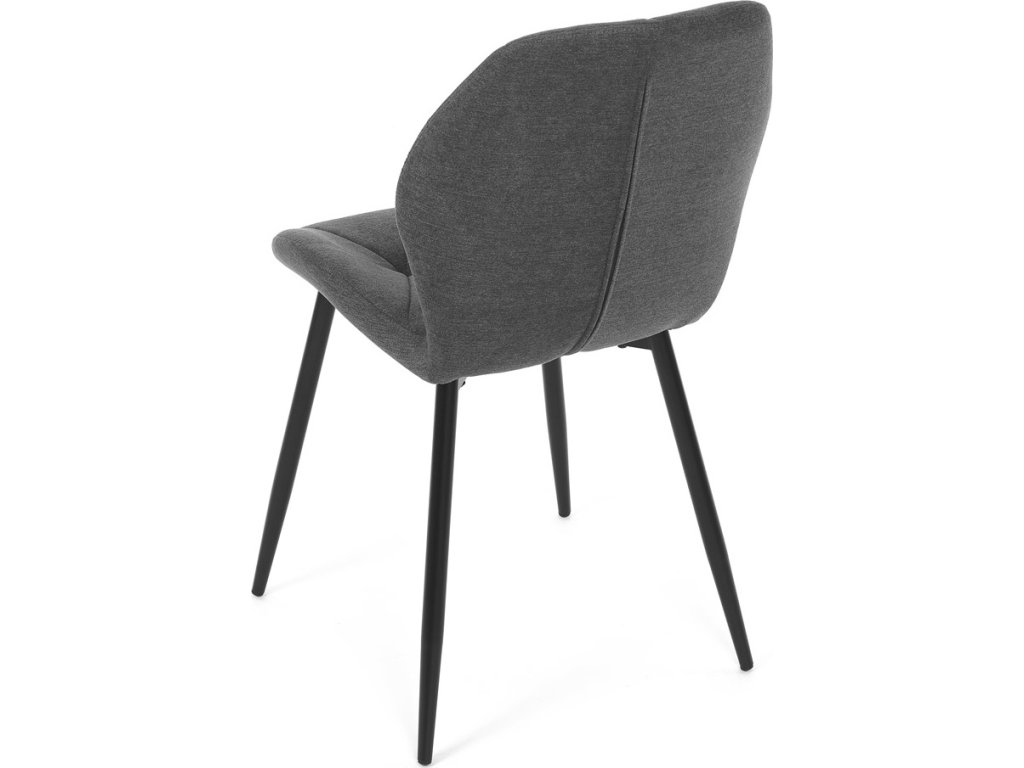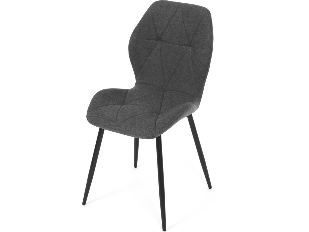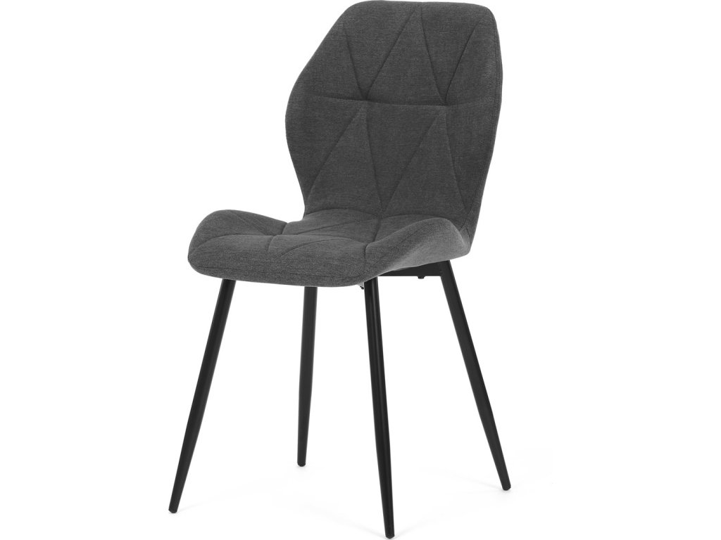Židle je čalouněná kvalitní tmavě šedou látkou, která je měkká na dotek a zároveň odolná proti opotřebení. Ergonomicky tvarované sedadlo a opěradlo s dekorativním prošíváním poskytují vysoký komfort i při delším sezení. Židle stojí na pevných kovových nohách v černém provedení, které zajišťují stabilitu a dlouhou životnost. Nohy jsou elegantně zkosené, což dodává židli moderní vzhled a zajišťuje pevnou stabilitu.