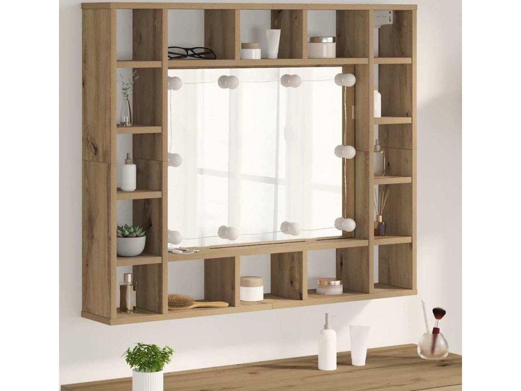 - Zahrnuté komponenty: Díky integrovanému osvětlení zrcadla, tato skříňka poskytuje dostatečné světlo pro přípravy. Odolné poličky nabízejí praktické úložiště. Každá polička udrží tvoje nezbytnosti přehledně organizované a na dosah.