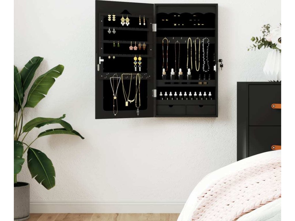- Dostatek úložného prostoru: Zrcadlová skříňka nabízí 2 zásuvky a spoustu háčků, věšáků a poliček, abyste měli šperky přehledně uspořádané a po ruce.