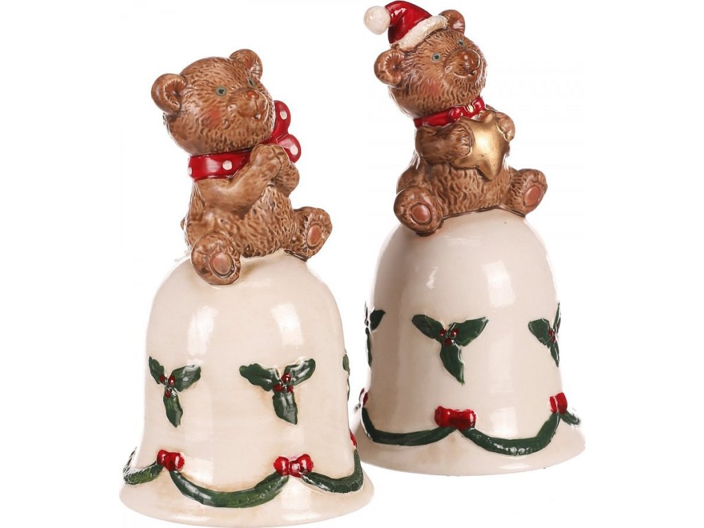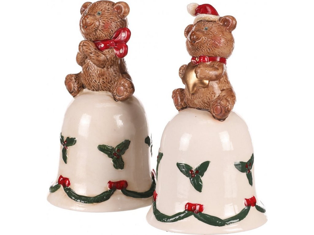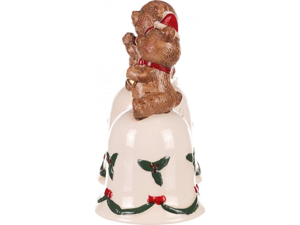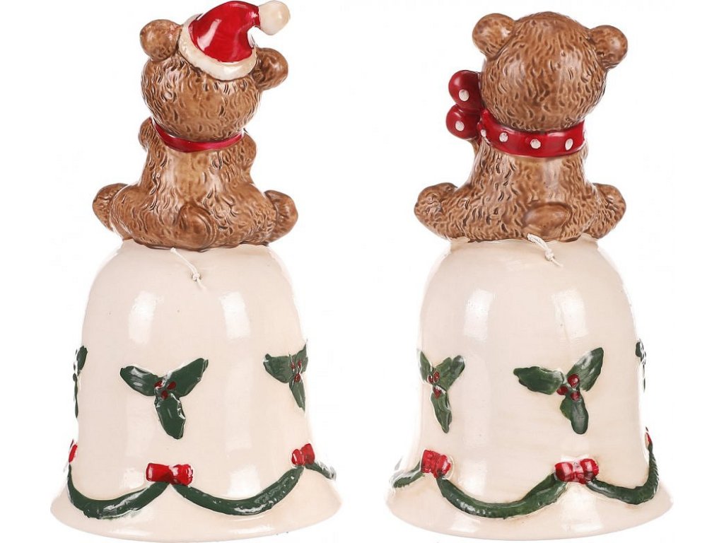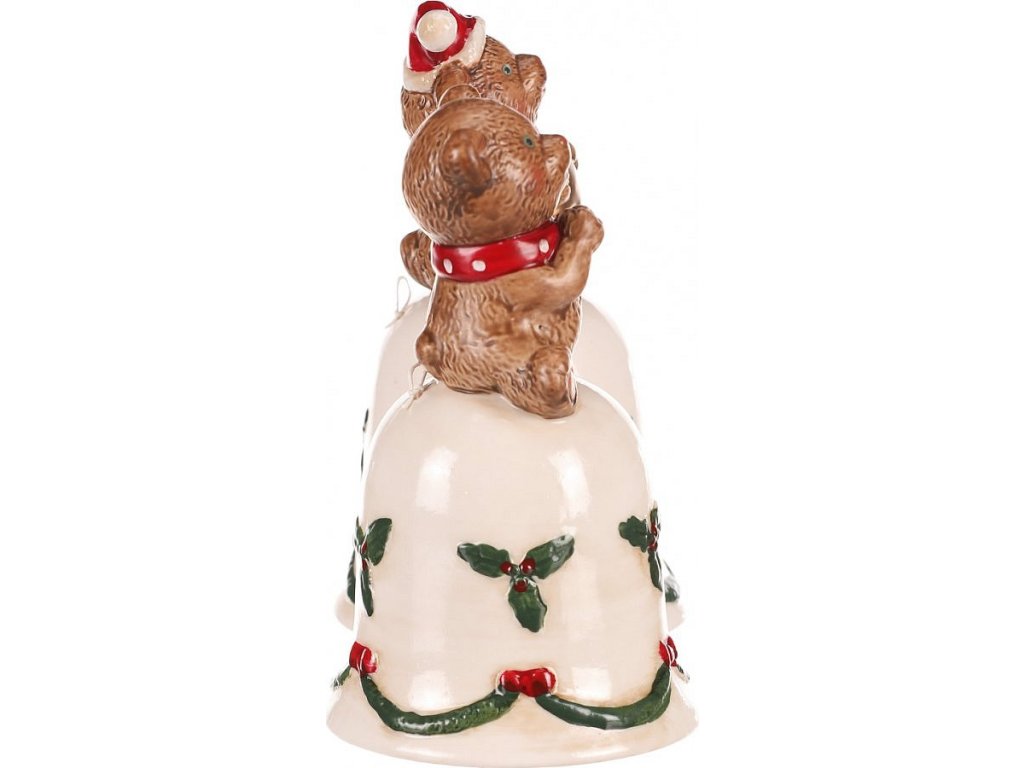 Obohaťte vaši vánoční výzdobu touto krásnou bílou dekorací ve formě zvonku s hnědým perníkovým medvídkem. Medvídek pohodlně sedí na vrchu zvonečku, vytvářejíc unikátní vizuální efekt. Tato ozdoba nabízí mix dvou druhů a umožňuje vám si zazvonit a třeba přivolat i samotného Ježíška. Je to nádherná ozdoba sama o sobě, ideální na postavení na poličku, stůl nebo do vitríny, přinášející vašemu domovu pohádkovou a radostnou atmosféru během vánočního období.